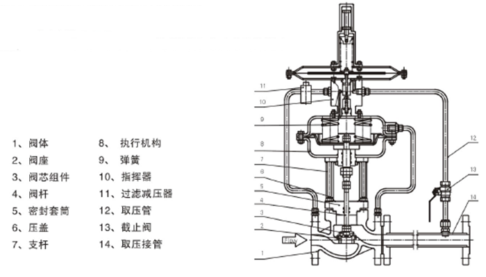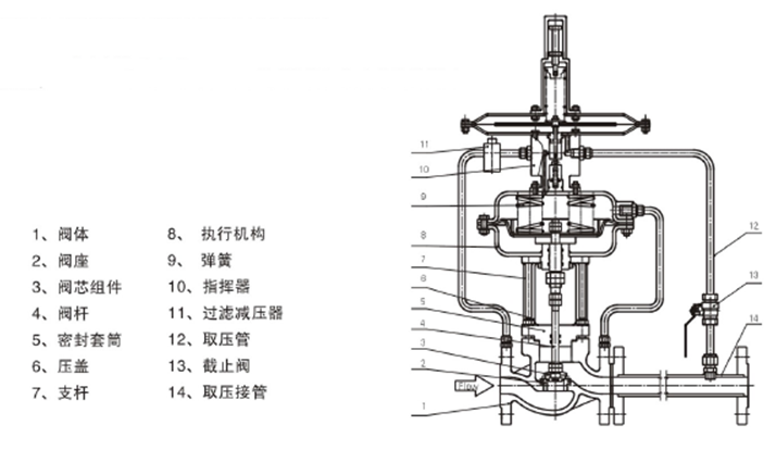 ◆自力式帶指揮器型壓力調節閥 結構組成部分: