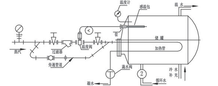 現(xiàn)以蒸氣或高溫水為例進(jìn)行說(shuō)明,蒸汽或高溫水在加熱器將冷水加熱到要求的溫度,在溫度閥前后裝有截止閥用于檢修或停止加熱時(shí),截?cái)嗔鬟^(guò)調(diào)節(jié)閥的蒸汽(或高溫水)。旁路則在調(diào)節(jié)閥故障或檢修時(shí)備用,正常運(yùn)行時(shí)旁路關(guān)閉。感溫包安裝的熱水的出口處。